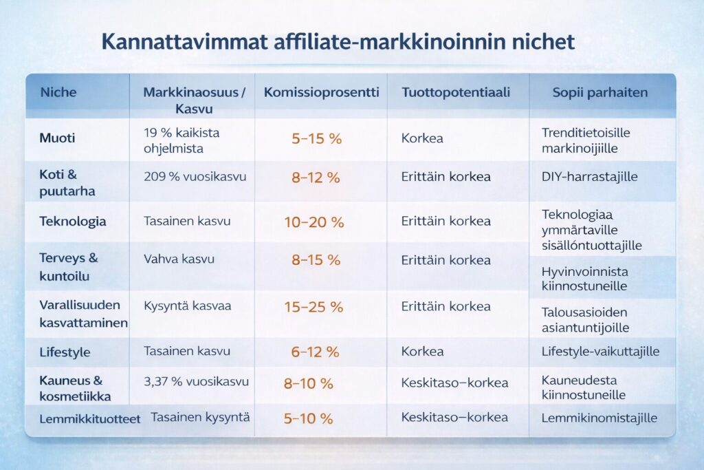 Seuraavaksi käymme läpi kaikkein kannattavimmat affiliate-markkinoinnin nichet, jotta voit valita juuri sinulle sopivan suunnan ja rakentaa passiivista tulovirtaa vuodelle 2026.